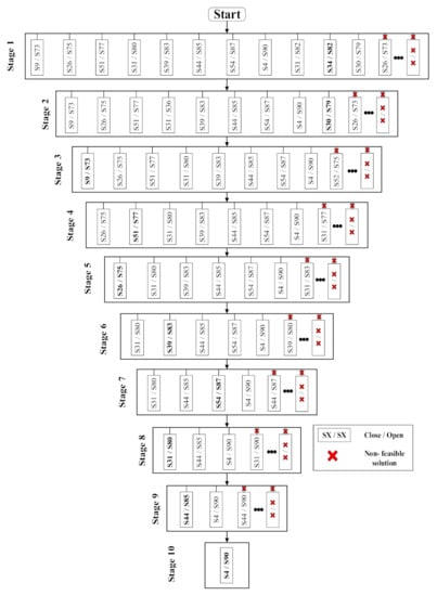 - Step 4: Evaluate the fitness of the switching combination based on Equation (1). Select the switching combination which provides the lowest fitness value.
