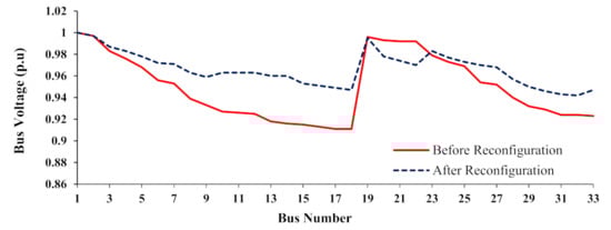 Network reconfiguration has been applied to the distribution network to improve efficiency, reduce power loss, and maximize the minimum voltage of the distribution network. The fitness function of the algorithm is calculated according to Equation (1). The active power losses attained from the proposed technique before and after the configuration are 208.459 kW and 138.928 kW, respectively. Figure 6 demonstrates the voltage profile of the 33-bus system before and after the reconfiguration. The lowest voltage of the 33-bus system has been enhanced by 3.46%, where the voltage of buses 19, 20, 21, and 22 reduces after the optimal reconfiguration is achieved. The reason behind that is the load transferred from the middle of the main feeder to the sub-branches. Table 1 summarizes comparative studies of NR techniques conducted on the IEEE 33-bus distribution system and shows the proposed method’s superiority.