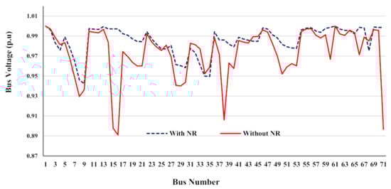 Similarly to the previous test system, NR has been implemented on a practical 71-bus system in Malaysia to enhance system performance, minimize power loss and improve the voltage profile of the distribution network. The objective function of the proposed algorithm is calculated based on Equation (1). The active power loss obtained from the proposed technique using the initial and final configurations is 228.78 kW and 169.91 kW, respectively. Figure 7 illustrates the voltage profile of the practical 71-bus system before and after the reconfiguration. The minimal voltage of the practical 71-bus system at bus 16 has been enhanced by 10.63% after changing the network’s topology. On the other hand, it can be noticed that the voltage of buses 7, 16, 28, 38, 50, and 71 increased and improved after the reconfiguration. Therefore, the new configuration of the system reduces the power loss and enhances the overall voltage profile. Table 2 demonstrates the performance of the proposed technique on the practical 71-bus system in Malaysia and highlights the NR before and after the implementation of the proposed method. The comparison with other methods is not considered for this case study because the network belongs to individual authority.