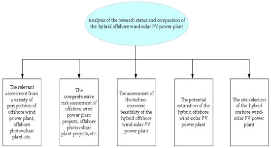 Up to now, there is little literature on risk assessment for the hybrid offshore wind–solar PV power projects, but the risk assessment has been implemented for other offshore renewable energy projects. For offshore wind projects, Dai, Ehlers et al. [6] analyzed the risk of collision between service vessels and offshore wind turbines and concluded that collisions between turbines and service vessels even at low speed may cause structural damage to the turbines; accordingly, certain risk responses were put forward in the aspect of design. Gatzert et al. [7] analyzed the risk and corresponding risk management both for onshore and offshore wind projects. Hong and Moller [8] focused on the economic risk assessment of offshore wind farms from the perspective of tropical cyclones. Snyder and Kaiser [9] studied the offshore wind plant using ecological and economic analysis. Shafiee and Dinmohammadi [10] comparatively analyzed the risks of onshore wind power and offshore wind power and proposed that both systems faced many of the same risks; however, there are some main differences worth considering. For photovoltaic power generation projects, Trapani et al. [11] proposed an alternative to flexible thin-film photovoltaics that floats on the water and focuses on technical and economical assessment of offshore PV systems at the waterline. Wu et al. [12] proposed a three-phase risk assessment model for the PV poverty alleviation projects. Kayser et al. [13] identified the most critical risk factors currently hindering the development of China’s PV projects using the improved Delphi method. Wu et al. [14] established a risk assessment framework of offshore PV projects based on the MAGDM method. A criteria system was built including risk factors in macro-economic, technical, environmental, and management aspects. A fuzzy comprehensive evaluation model was also constructed by combining the hesitant linguistic fuzzy sets, triangular fuzzy sets, and analytic network process (ANP) methods. Gao et al. [15] considered market risks, established an index system including economic, technical, environmental, and market risk factors, and established a comprehensive risk assessment framework for offshore PV projects under probabilistic language term sets. Considering the uncertainty of processing information and the confidence of expert judgement, Zhou et al. [16] established a risk assessment model of China’s offshore photovoltaic power generation projects with D-number and ANP method. In addition, Wu et al. [17] established a risk assessment model of an offshore wave–wind–solar–compressed air energy storage power plant based on the fuzzy comprehensive evaluation method. For the hybrid offshore wind–solar PV power projects, Mario López et al. [5] assessed the potential for developing floating wind and solar energy off the coast of Asturias and demonstrated a production synergy of offshore wind–solar farms. Syed Raahat Ara et al. [18] proposed a two-level planning approach to analyze techno-economic feasibility of hybrid offshore wind–solar PV power plants. Dhunny, A Z studied the site selection of hybrid onshore wind–solar PV power plants [19]. Figure 1 illustrates the analysis of the research status of the hybrid offshore wind–solar PV power plant and the comparison with other offshore new energy power plants. It is obvious that risk assessment of hybrid offshore wind–solar PV power generation projects has not been extensively studied. Hence, this paper will draw on the research published on other energy projects to establish a targeted and practical indicator system and a comprehensive risk assessment framework suitable for hybrid offshore wind–solar PV power generation projects.