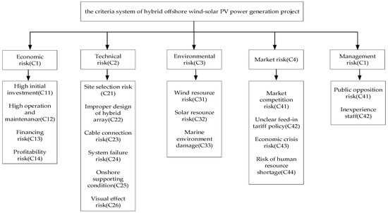 It is an essential prerequisite for investors to identify risk factors to conduct risk management [40]. In this study, the literature review method was first adopted and databases such as the web of science and Elsevier were used. Moreover, literature published by domestic and foreign scholars were searched using keywords such as offshore wind power, offshore photovoltaic, and offshore new energy projects. We obtained extensive articles on the risk assessment of these projects [6,7,8,9,10,14,15,16,17]. At the same time, the risk factors can be collected by referring to the conference reports of offshore new energy projects and case studies of existing offshore new energy projects. Through the above activities, we obtained a large number of risk indicators of offshore new energy power generation projects. Then, three experts with rich experience in offshore energy projects were invited to set up an expert committee. The expert committee selected and classified the large collection of risk indicators according to their frequency and weight in published articles. Finally, the expert committee determined the risk criteria system of the hybrid offshore wind–solar PV power generation project through repeated discussion, 19 risk factors were identified, and they were divided into five groups. The risk criteria system is shown in Figure 2.