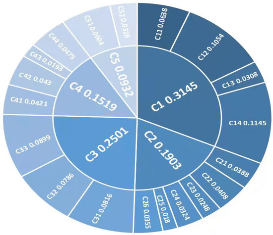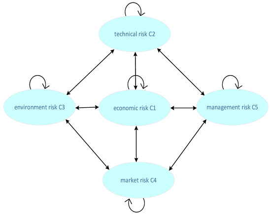 In the risk assessment of the project, the importance of each criterion is different, so the importance of each criterion needs weight to reflect it. At the same time, there is a certain correlation among these criteria. For example, improper design of a hybrid array (C22) and unreasonable site selection (C21) of the hybrid power plant will increase project operation and maintenance costs (C12). Considering this situation, the ANP method is used in this paper to determine the weight of attributes. Firstly, the expert group analyzed and determined the intrinsic dependence among the criteria. Secondly, we used a 1–9 scale method to determine the risk degree of each criterion and made pairwise comparisons to obtain the judgment matrix. After calculating the judgment matrix, the unweighted super matrix can be obtained. Thirdly, the influence matrix of the index group was obtained by comparing the relationships between the index groups. Finally, the super weighted matrix and limit matrix were obtained using software calculation, and the global weight and local weight of the indicator were obtained [14].