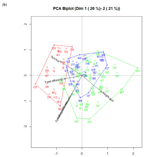 Otherwise, in graphic (b) there are also differences between the clusters. Cluster 1 (color red) indicates the presence of 19 juvenile L. vannamei shrimps fed with the mixture M2 with higher relation to feed efficiency, whereas Cluster 2 (color blue) indicates the presence of 30 juvenile L. vannamei shrimps fed with the mixture M2 with higher relation to all the parameters, and Cluster 3 (color green) indicates the presence of 41 juvenile L. vannamei shrimps fed with the mixture M2 with higher relation to specific growth rate, weight gain, and protein efficiency ratio.