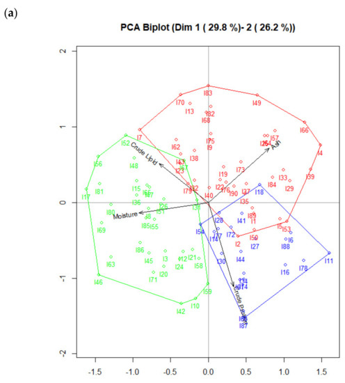 We observe, in graphic (a), important differences between clusters. Cluster 1 (color green) indicates the presence of 35 juvenile L. vannamei shrimps fed with mixture M1 with higher relation of moisture and crude lipid, while Cluster 2 (color red) indicates the presence of 36 juvenile L. vannamei shrimps fed with mixture M1 with higher relation to ash, and Cluster 3 (color blue) indicates the presence of 19 juvenile L. vannamei shrimps fed with mixture M1 with higher relation to crude protein. On the other hand, in graphic (b) there are also differences between the clusters. Cluster 1 (color green) indicates the presence of 23 juvenile L. vannamei shrimps fed with mixture M2 with higher relation to crude protein and crude lipid, whereas Cluster 2 (color blue) indicates the presence of 30 juvenile L. vannamei shrimps fed with mixture M2 with higher relation to ash, and Cluster 3 (color red) indicates the presence of 37 juvenile L. vannamei shrimps fed with mixture M2 with higher relation to ash and moisture.