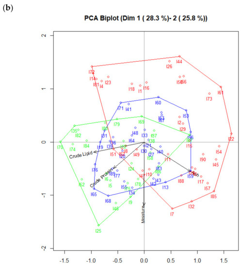 (a) PCA Biplot for nutritional composition of juvenile L. vannamei shrimps fed with mixture 1; (b) PCA Biplot for nutritional composition of juvenile L. vannamei shrimps fed with mixture 2.