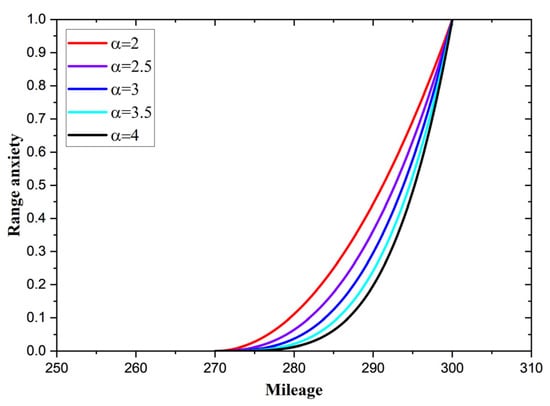 When using the power function to describe range anxiety, no matter how α changes, the Rmax reaches the maximum value of 1. When using the exponential function to describe range anxiety, the maximum value Rmax increases with the increase in α. Therefore, using the power function to describe range anxiety has a certain advantage in terms of dimensional unity. These diagrams can help drivers to effectively understand the changes in range anxiety. In addition, the slope of range anxiety can be controlled by replacing e in the exponential function with other constants.