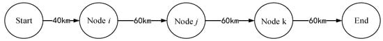 Suppose that the total range of the electric vehicle is 100 km, the shortest path between the starting point and the destination is 220 km, and there are three nodes in the middle. Because the vehicle still has a 60 km range (more than half of the range) when it reaches node i, the driver will choose to use all of the electricity to reach node j, and a charging station should be set up at node j. When the vehicle arrives at node k from node j, the remaining power is only enough to drive 40 km, and cannot continue to reach the final destination. A charging station must therefore be set up at node k so that the driving distance can be extended at least 20 km to reach the destination.