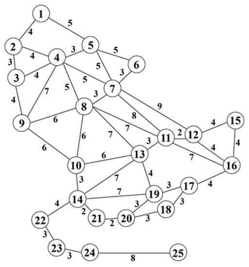 This network has been applied to the research of electric vehicle charging station location optimization by many experts and scholars, such as Hodgson [], Kuby [,,], and Berman et al. []. The length of the road section and the importance of the nodes in the network use the data of Berman. At the same time, the length of the road section is also the range consumption of the electric vehicle driving through the road section, and the unit length represents 30 km. All of the nodes in the network can be used as the starting point, destination, and candidate location of the charging station. There are 300 OD pairs and 25 candidate locations of the charging station. The gravity model is used to estimate the traffic flow of each OD pair of electric vehicles, as shown in Equation (24):