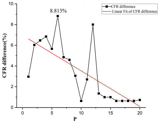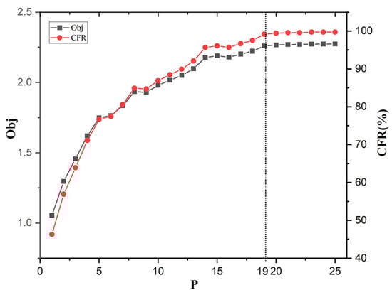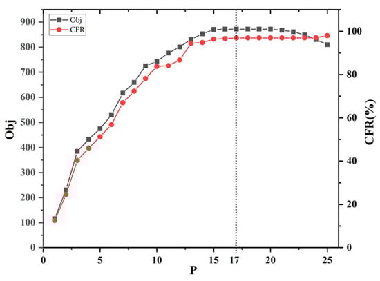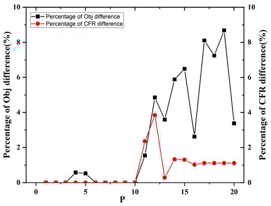 The ratio of Obj difference (the ratio of the difference in Obj between the two models to the Obj of model 1) and the ratio of CFR difference (the ratio of the difference in CFR between the two models to the maximum flow model’s CFR) were compared with the number of charging stations built, as shown in Figure 7. It can be seen that except for the proportion of CFR difference being higher than that of Obj difference when the number of charging stations is 11, in other cases, the proportion of Obj difference is higher than that of CFR difference. This shows that the degree of reduction in traffic interception caused by range anxiety in model 1 is less than that in the maximum flow model, which only considers the increase in range anxiety. At the same time, it shows that when the weight ratio is a large value, model 1 and the maximum flow model can intercept the same traffic, but in the solution of model 1, the driver has less range anxiety and the location result is better. The above effect can be achieved when the weight ratio is 100:1.