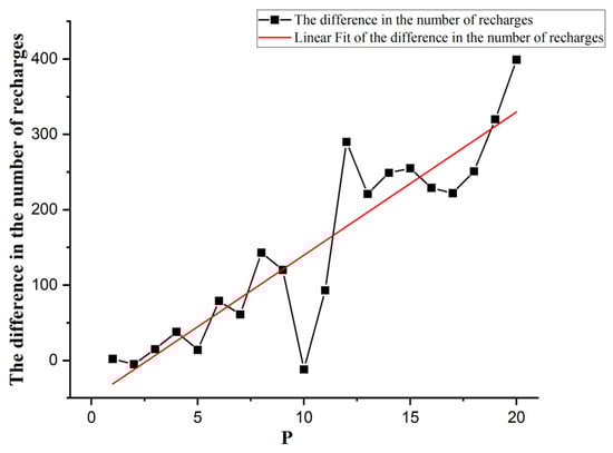 Because model 2 assumes that the driver must be recharged when they arrive at the charging station, it will result in more charging instances than model 1, as shown in Figure 9. With the increase in the number of charging stations, the difference between the numbers of charging instances of the two models increases. When the number of charging stations is 20, the difference between the charging instances of the two models reaches the maximum of 399 times. The huge difference in the number of instances of charging first means huge charging costs and operating costs, including the driver’s charging costs and time costs. Taking the reasonable construction number of 17 charging stations as an example, the difference between the numbers of charging instances of the two models is 222, and the difference in feasible path flow is 6. It is preliminarily estimated that the average cost of each charge of an electric vehicle is CNY 146.4, and the average penalty cost per unit of travel is CNY 922.4. Compared with model 2, model 1 saves CNY 32,500.8 in charging costs and a further CNY 5534.4 in penalty costs; that is, model 1 saves CNY 26,966.4 compared with model 2.