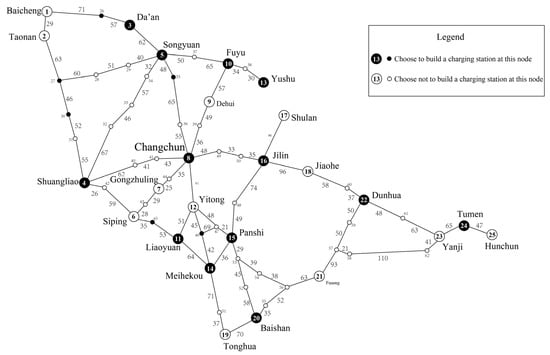 Assuming that the range of the electric vehicle in the expressway network of Jilin Province is DR = 240 km, the number of charging stations to be built is , the weight ratio is set to , and the other parameters follow the value of the 25-node traffic network example. The Tabu search algorithm is used to solve the problem, and the number of iterations is 1 million. The results are shown in Table 6.