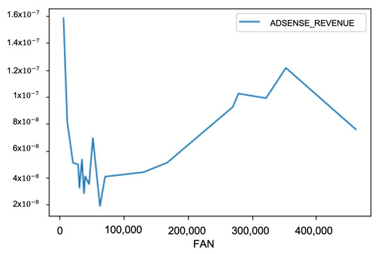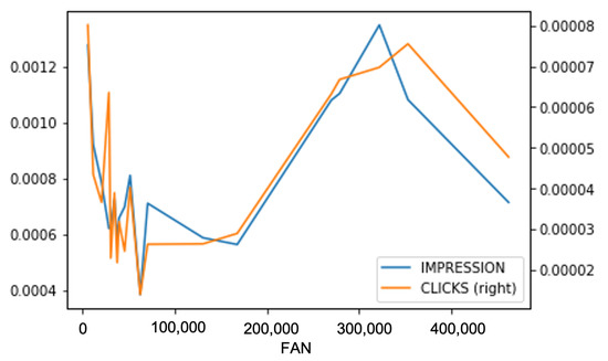 The number of subscribers of the Facebook pages used in this study varies greatly. The smallest one has just over 6 K subscribers, and the largest one has over 450 K subscribers. Larger Facebook pages generate more impressions, clicks, and advertisement revenue from our data. Still, we would like to observe whether there would be any difference in the performance of individual posts on a per-user, per-post basis. In Figure 1 and Figure 2, we can see that the Facebook pages with the smallest and largest numbers of fans perform better than the ones that have a moderate number of fans. The trend is consistent across impressions, clicks, and advertisement revenue generated.