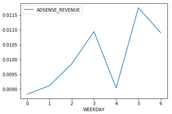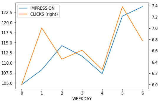 Past studies have shown that temporal features can affect Internet user behavior [27]. During holidays, users have more free time to spend surfing the Internet, which can positively affect the performance of social media postings. On the other hand, people have less time to surf the net on work days. Hence, the expectation of high performance is lower. In Figure 3, the x-axis is the day of the week, with 0 being Monday. Impressions and clicks mostly follow the same trend, except for Monday and Sunday. To highlight this difference, we calculate the ratio of clicks versus impressions and illustrate it in Figure 4.
