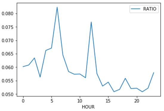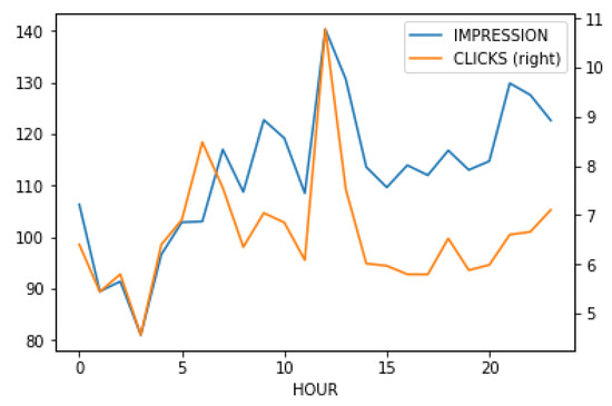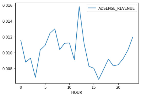 Past studies have also used “hour-in-a-day” as a predictive feature [27]. In the era of mobile Internet, however, the time slots of a user using the Internet heavily has been extended from evening to midnight to include the time of commute. We analyze the correlation between time in a day and the performance metrics to obtain a better idea. Figure 6 shows that around noon and around 11:00 p.m. are the peaks for both impressions and clicks. However, it is interesting that the morning hours perform well, just like the afternoon hours—to our surprise. The click-per-post rate is also higher at around 6:00 p.m. To investigate this further, we illustrate the click-to-impression ratio, as in Figure 7. The two peaks, where the best clicks-to-impression ratio occurs on social media posts, are around 6:00 a.m. and noon. In Figure 8, it shows that the best time for a publisher to earn money through posting social media posts is indeed around noon, with 6:00 a.m. and midnight as a close second and third, respectively. The 6:00 a.m. spot shows that many people browse the Internet early in the day.