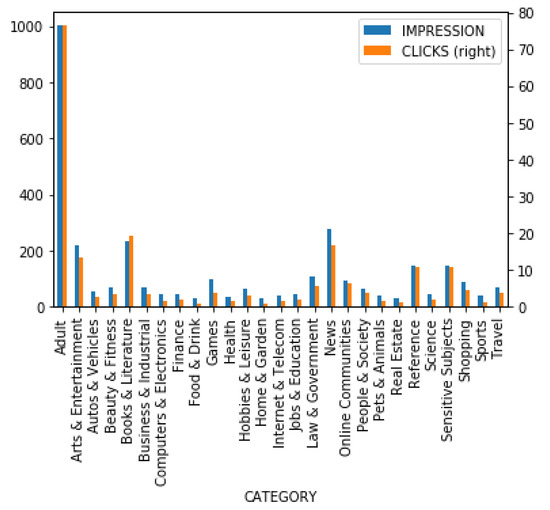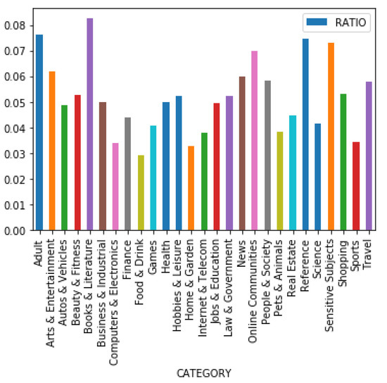 Figure 10 gives us an idea about the click–impression ratio of posts of different categories. The ratio is between 0.03 and 0.08 across categories, and “Books and Literature” has the highest ratio. The other leading categories are “Adult”, “Online Communities”, “References”, and “Sensitive Subjects”. Figure 10 shows that certain social media posts of certain categories do have an advantage over other posts. However, for a user to reach the actual content, it has to be seen first, which is determined by the social media platforms (i.e., Facebook).