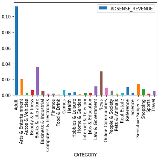 Here we turn to the analysis of actual revenue generated. Figure 11 shows that there is a significant difference in revenue generated per post. For the category “Adult”, the revenue per post exceeds 0.10, while categories such as “Food and Drink” generate nearly no revenue per post. Coupled with the previous figures, it is clear that the revenue is related to the category of social media posts. As a content-based advertisement platform, Google AdSense posts advertisements related to the content of articles. To generate more revenue, the content publisher not only has to obtain as much traffic as possible, but they also have to publish the “right” content.