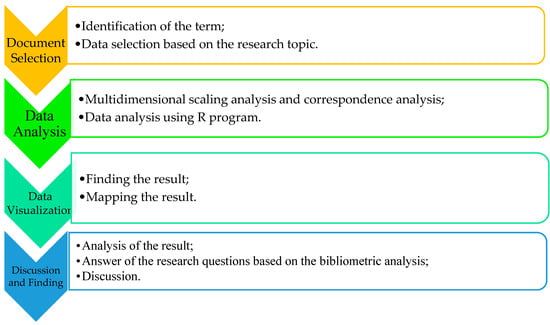 Bibliometric analysis has been applied to the research as an approach to analyzing scientific documents, such as the management field in manufacturing [37], sustainability [38], and the tourism sector [39]. In the scientific paper, bibliometric analysis has been often used, such as in co-citation analysis, bibliometric coupling, word analysis, cluster analysis, and co-authorship analysis [37,40]. The process of data analysis using bibliometrics is explained in Figure 1.