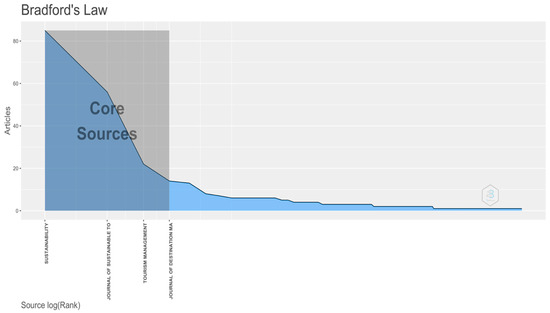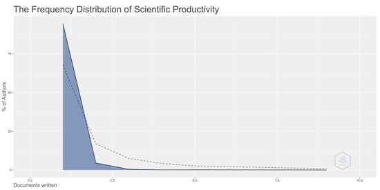 Figure 3 uses Bradford’s law. Bradford’s law explains how the articles in the field are spread across journals, and the majority of the articles in the area are centered based on core journals [54]. The results show a large number of journals that are published with few documents [55]. As shown in Figure 3, Bradford’s law explained that the core journals that have been published in sustainable tourism, such as the Sustainability Journal, Journal of Sustainable Tourism, Tourism Management, and the Journal of the Destination Marketing and Management are the main journals in sustainable tourism. Furthermore, Figure 4 explains Lotka’s law analysis for the distribution of the journals. Lotka’s law analysis is the frequency of the journal or the documents written by the authors, based on the focus of the study [56]. From Figure 4, we can conclude the results of the study, which had many authors, with around 1443 authors having only one document written, which accounts for 94.5% of the total contributions of the authors.