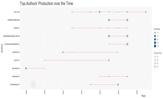 Figure 5 shows the 10 authors’ productions in the papers based on the research topic in tourism management and marketing in sustainable tourism. The results show that Hall, C.M. is the most popular production from 2013 to 2021. The second most popular production in the research topic is Campon-Cerro, A.M. between 2017 and 2019. The third most popular author is Dwyer, L. in 2013 and from 2016 to 2019. The fourth most popular is Hernandez-Mogollon, J.M., and the fifth most popular is Folgado-Fernandez, J.A.
