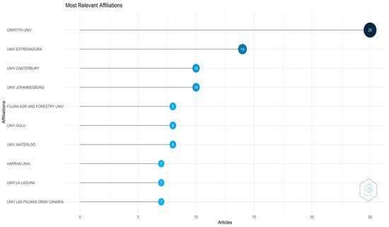 Figure 7 explains the distribution of scientific documents by institutions or affiliations. The result shows that 10 universities published the most in the field of study. The first-placed is an Australian university, which has the leading institution in publishing scientific documents on marketing, management, and sustainable tourism, namely Griffith University, with 25 document articles. The University of Extremadura from Spain is the second most represented affiliation in publishing scientific documents, with 14 articles. In addition, there are universities such as the University of Canterbury in New Zealand and South Johannesburg University in South Africa, which are institutions that published 10 articles. Fujian and Forestry University in China, University Oulu in Finland, and Canada University Waterloo in Canada had 8 publications. The last institutions that published articles in sustainable tourism related to management and marketing are Harran University in Turkey, University La Laguna in Spain, and University Las Palmas Gran Canaria in Spain, with seven publications.