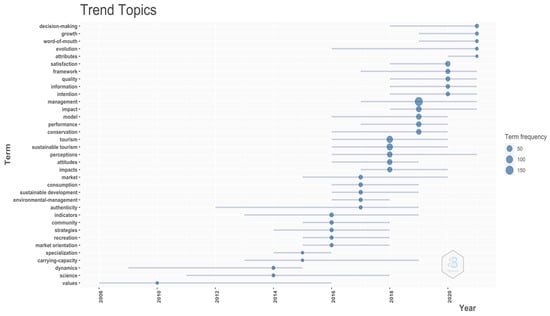 Furthermore, for the trend topics that have been covered by the authors from 2008 to 2021, the trend topics are divided into periods. In the period of 2017–2021, trend topics such as the word “management” were the most frequently used by the authors in tourism management and marketing toward sustainable tourism. The second most popular trend topic is “tourism” from 2016 to 2020. In addition, the term “sustainable tourism” was used to cover the research topic in sustainable tourism. Furthermore, in the year 2021, some of the trend topics covered by the authors include the words “decision making”, “growth”, “word of mouth”, “evolution”, and “attributes”.