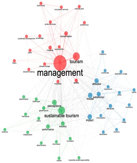 Furthermore, words such as “conservation”, “impacts”, “climate change”, and “quality” are keywords that have appeared in the red cluster. The second cluster is a blue color. The most powerful word in this cluster is the word “impact”. In addition, some words such as “model”, “attitude”, “satisfaction”, and “behavior” are representative of the words in the blue cluster or the second cluster. The last cluster in this section is cluster three or the green cluster. The biggest word in this cluster is “sustainable tourism”. In addition, some other words also represented in this cluster, such as “perceptions”, “performance”, “industry”, “governance”, and “framework”.