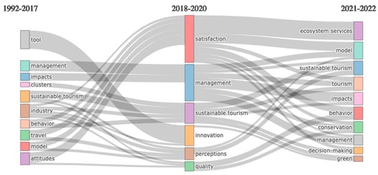 Figure 12 presents the thematic evolution of the papers from 1992 to 2021. From the figure, we can conclude that the thematic evolution of the papers is divided into three periods. In the first period from 1992 to 2017, the thematic evolution is covered by “tool”, “management”, “impact”, “cluster”, “sustainable tourism”, “industry”, “behavior”, “travel”, “model”, and “attitude”. The second thematic evolution period is from 2018 to 2020, and in this period the thematic evolution is covered by themes such as “satisfaction”, “management”, “sustainable tourism”, “innovation”, “perceptions”, and “quality”. The last thematic evolution in 2021, and the thematic evolution is covered by words such as “ecosystem services”, “model”, “sustainable tourism”, “tourism”, “impacts”, “behavior”, “conservation”, “management”, “decision making”, and “green”.