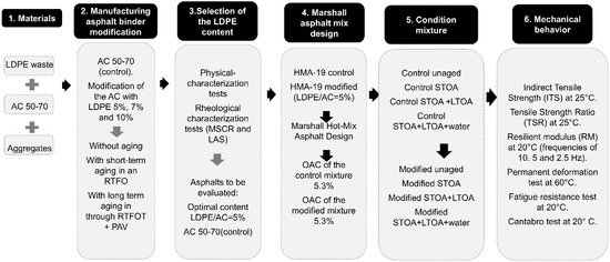 In the present study, unlike those mentioned previously, (a) the mechanical behavior of a modified HMA with an LDEP-type plastomeric waste was evaluated after selecting, through a physical-rheological characterization, the best content of this additive in its incorporation into a wet-modified asphalt binder (in this way, an investigation of both the response of the asphalt binder and the modified mixture is presented); (b) the additive used corresponded to the waste of mixing straws used in hot drinks (this is a particular study compared to other studies, which revised the behavior of asphalt binders with the inclusion of LDPE pellets that were taken directly from production plants); (c) an sustainable alternative for the use of waste from LDPE straws was studied, using temperatures and mixing times of the LDPE with the asphalt binder lower than the traditional ones, and using a lower mixing temperature of the modified asphalt binder with the aggregates compared to similar studies; (d) the modified mixtures were exposed to an experimental phase where their mechanical response was evaluated, trying to simulate aspects associated with their durability, understood as the long-term ability of a material to resist changes in climate, aging, and the abrasive action of traffic [25].