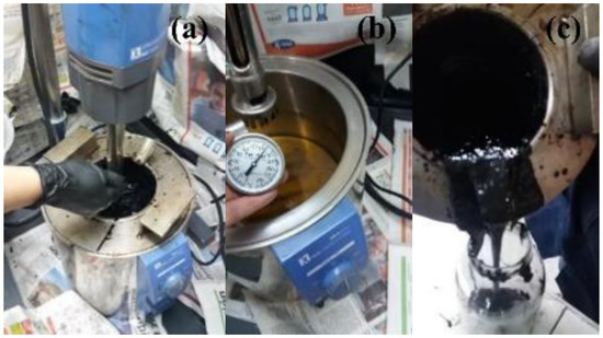 AC 50–70 was mixed with the modifier by the wet process, using LDPE contents of 5%, 7%, and 10% concerning the mass of the AC (called LDPE/AC = 5%, 7%, and 10%, respectively). Table 3 shows the mixture temperature, mixture time, and mixture speed of various modified asphalt binders’ LDPE, which have been reported in other studies. In these earlier studies, the implementation of mixture temperatures up to 180 °C and mixture times up to 120 min was observed. However, in the present investigation, the mixture time and mixture temperature of the AC with the LDPE were 20 min and 145 °C ± 5 °C, respectively (see Figure 3). To mix both materials, a speed of 4000 rpm was used, with high-cut mixing equipment.