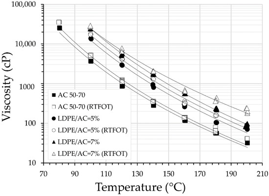 The results of the physical characterization tests carried out on the AC 50–70 control asphalt binder and the modified ones (LDPE/AC = 5%, 7%, and 10%) are presented in Table 5. Figure 4 presents the viscosity curves obtained from torsions applied with No. 21 and No. 29 needles to asphalt binder samples between 100 °C and 200 °C with test intervals of 20 °C. Each test was performed on three samples. (Table 5 shows the average of the results obtained.)