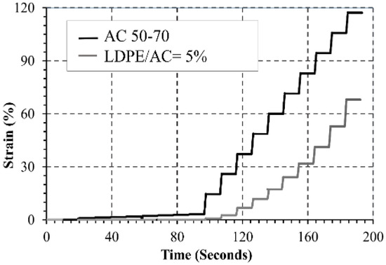 Based on the results shown in Table 5 and Figure 4, it was decided to choose 5% as a modification percentage (LDPE/AC = 5%). Additionally, this percentage was chosen considering the following criteria: (1) it was recommended in previous studies (e.g., [19,21,24]); (2) using 7% and 10%, the increase in stiffness can generate brittle behavior in the mixture, difficulty during the compaction process, and a tendency to increase manufacturing temperatures; and (3) the rheology tests could not be carried out on the asphalt binders modified with 7% and 10% LDPE, since the reduced thickness of the tablets, together with the large content of LDPE by volume, would cause the shear stress to be applied directly on the elastomer particles that are on the surface.