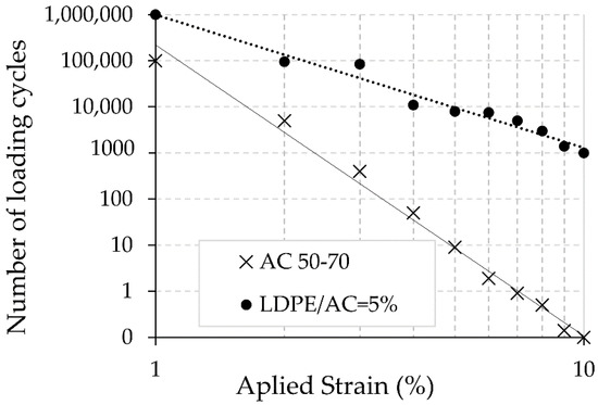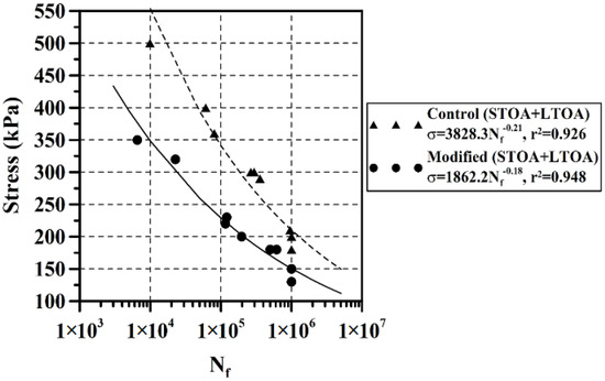 Fatigue resistance under controlled stress of the long-term aged samples (STOA + LTOA) is presented in Figure 14. It was observed that under this aging condition, the modified mixture with LDPE underwent less resistance to fatigue. This was due to the following factors: (1) in the LAS test, the modified asphalt binder underwent less resistance to fatigue; (2) the LDPE-modified asphalt binder decreased the PG at intermediate service temperatures compared to AC 60–70; (3) the modified mixture had a higher Va (7.3 ± 0.3% in average) compared to the control (4.9 ± 0.4%); and (4) based on the VFA values, the asphalt binder content in the modified mix may not have been sufficient to cover the aggregates.
