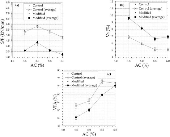 The results of the Marshall for the control HMA-19 and the modified mixtures are presented in Figure 7. Although the modified asphalt binder was stiffer than AC 50–70, the modified mixes underwent less resistance under monotonic loading (evaluated through of the S/F ratio) compared to the control mix for any percentage of asphalt binder content (Figure 7a). This was mainly because the modified mixes were more porous (they had higher Va and lower VFA, as shown in Figure 7b,c) compared to the control mix. Despite the above, the modified mixtures presented resistance values higher than the minimums established for HMA-19 mixtures by Colombian standards.