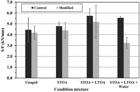 The variation of the ratio S/F for the mixture control and modified LDPE mixture under conditioning considered (STOA; STOA + LTOA; and STOA + LTOA + water) is shown in Figure 8. An increase in the S/F ratio was observed with the age of the samples in the short term (STOA) and the long term (STOA + LTOA). This was due to the increase in stiffness undergone by the asphalt binder as it aged. Additionally, it was observed that the modified mixtures presented lower S/F compared to the control sample, due to their higher Va content. However, the S/F difference between both aged mixtures in STOA and STOA + LTOA was not statistically significant based on the ANOVA analysis (F < F0.05).