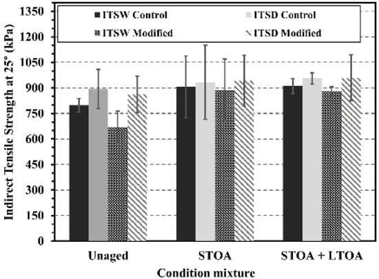 The average of resistances ITSD and ITSW for the control mixture and the mixture-modified LDPE under STOA and STOA + LTOA is shown in Figure 9. It was observed that the control and the modified mixture slightly increased both mechanical parameters when they were exposed to aging processes. Additionally, it was observed that both mixtures presented similar magnitudes of ITSD and ITSW, except for the sample without aging, where a decrease in the ITSW parameter to ITSD was visualized. However, no change reported in the test was statistically significant according to the ANOVA analysis, since for all cases F < F0.05. The evolution of the parameter TSR is shown in Figure 10. The modified mixture underwent lower TSR values under any conditioning compared to the control mixture. The greater effect on the moisture damage of the mixture with LDPE was perhaps due to the higher Va (7%) compared to that of the control (5.1%). Nevertheless, as in the Marshall test, the reported changes in TSR between both mixtures were not statistically significant based on the ANOVA analysis (F < F0.05).