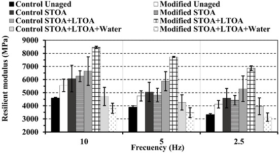 The average RM obtained for the control mixture and the modified mixture with LDPE under the conditions considered (STOA; STOA + LTOA; STOA + LTOA + water) is presented in Figure 11. The typical increase in RM values was observed as the charging frequency increased. A typical increase in RM was also observed as the mixtures aged in the short term (STOA) and the long term (STOA + LTOA) as a product of the increase in the stiffness of the asphalt binder. Both mixtures underwent similar increases when aging in the long term (between 45% and 67%, depending on the test frequency).
