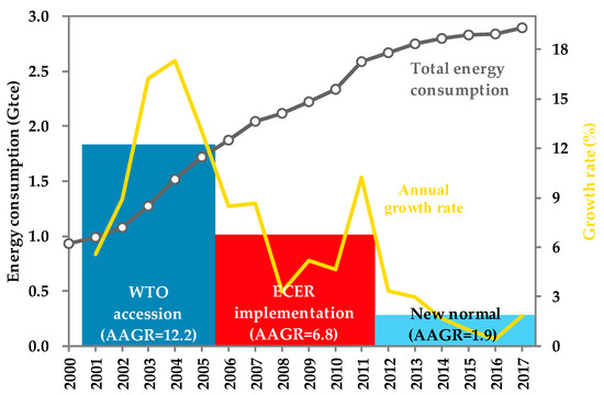 Thus, the whole period of 2000–2017 is divided into three sub-periods in this study. The first sub-period, named WTO accession following Zheng et al. [2], covers 2000–2005, when China’s energy consumption grew at a high rate, with an AAGR of 12.2%. The second sub-period, named ECER implementation, includes the years between 2006 and 2011, when severe ECER policies were implemented, leading to a significant decline in energy consumption growth, with an AAGR of 6.8%. The third sub-period represents the “new normal” stage, from 2012 to 2017, with an AAGR of 1.9%. Both of the latter two sub-periods were constrained by severe ECER policies. To conduct a comparative analysis, the second sub-period is seen as the old growth model stage in this study.