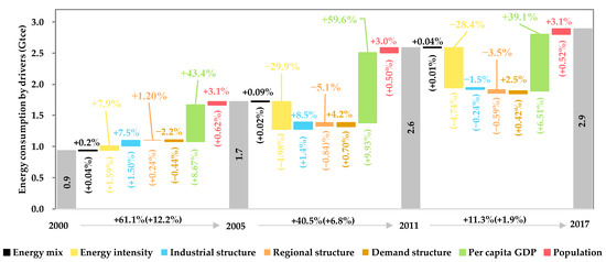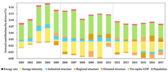 Figure 2 was created to show the annual contributions of each driver to China’s total energy consumption growth. It is shown that the annual growth of total energy consumption was mainly caused by the per capita GDP. Combined with population growth, it is the GDP growth that held the top contributor to energy consumption growth. Meanwhile, energy intensity acted as the strongest negative contributor to energy consumption growth most years (except for 2003–2005). This finding is supported by the average annual declining rate of energy intensity of −3.9%, indicating a general steady improvement in energy consumption efficiency. Meanwhile, during the 2003–2005 period, energy intensity exerted a positive effect on energy consumption growth. This was because most industries transformed into becoming energy-intensive during the heavy industrialization process [36]. The industrial structure promoted energy consumption during 2000–2013 due to the continuous expansion of the secondary industry with its value-added share to GDP increasing at an average annual rate of 1.4%. However, from then, the industrial structure contributed to offsetting energy consumption, due to the fact that China entered the “new normal” stage and the secondary industry share of GDP started to decline. The energy mix generally made a small but positive contribution to energy consumption growth; however, this contribution has become negative in some recent years (e.g., 2013 and 2016), implying a mitigating effect of energy transition at the “new normal” stage. The effects of regional structure and demand structure on energy consumption change were volatile over time, which needs further analysis to find out potential changing patterns.