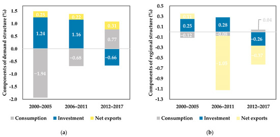 The regional structure effect experienced a U trend among stages, from 0.24%, to −0.84%, and to −0.59%, which is not very in line with the findings in [2], especially in the period prior to 2012. This may be explained by the different measurements of the regional structure. Their measurement of the regional structure is the same as the common regional structure defined in Equation (1); however, in this study, the common regional structure is further decomposed into the final use-based regional structure and the (national) demand structure, which is absent in [2]. Moreover, in this study, the regional structure effect is made up of consumption-based, investment-based, and net export-based regional structure sub-effects. The negative regional structure effect in the “new normal” stage was mainly caused by net exports (−0.37%), followed by investment (−0.26%), while the consumption contributed positively to the regional structure effect by 0.04% (see Figure 4b).