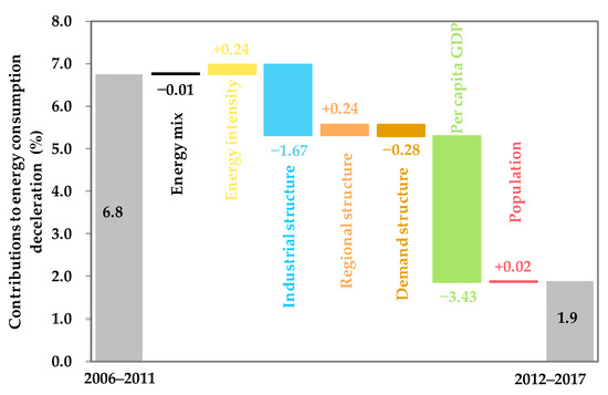 Overall, we find that the structural effects (including energy mix, industrial structure, regional structure, and demand structure) and efficiency gains (i.e., energy intensity) together decelerated the energy consumption growth by −1.46% between stages. Meanwhile, the economic growth (i.e., per capita GDP plus population) contributed to the deceleration in energy consumption growth by −3.41%. In this sense, China’s current development pattern seems unsustainable in terms of energy consumption deceleration, because this deceleration was mainly at the expense of economic expansion.