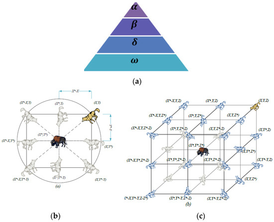 (a) Parameters of GWO (b) 2D and (c) 3D DLH and possible next locations.