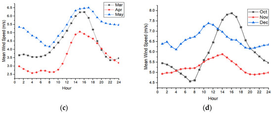 Variation trend of wind speed (a) days, (b) weeks, (c) months, and (d) years.