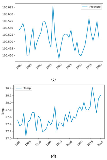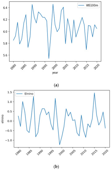 (a) Wind speed, (b) El Niño, (c) pressure, and (d) temperature of the Radhapuram site at 100 m hub height.