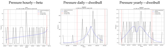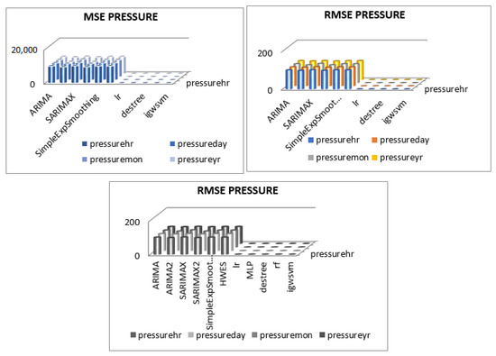 Pressure comparisons of various models for the different forecasting period (pressurehr—hourly pressure, pressureday—daily pressure, pressuremon—monthly pressure, and pressureyr—yearly pressure).