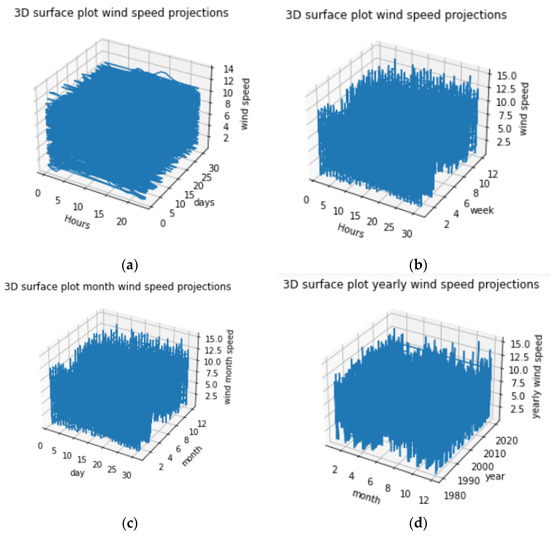 Precise wind-haste predicting is vital for sustainable power development scheduling and the functioning of a power system. Figure 11 displays the deviation fashion of wind power for an hour, month, week, and year, assuming the probable substantial wind power near the spaces and those wind plants situated in the demand center [46], with the Radhapuram wind farms receiving higher attention in Tamilnadu. Similarly, wind speed for the same case is illustrated in Figure 12 using the 3D model.