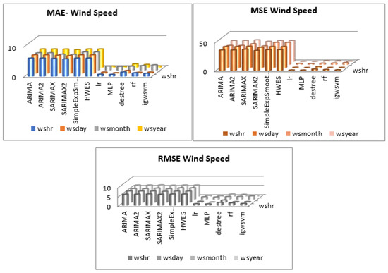 Wind speed comparison of various models for the different forecasting period (wshr—hourly wind speed, wsday—daily wind speed, wsmonth—monthly wind speed, and wsyear—yearly wind speed).