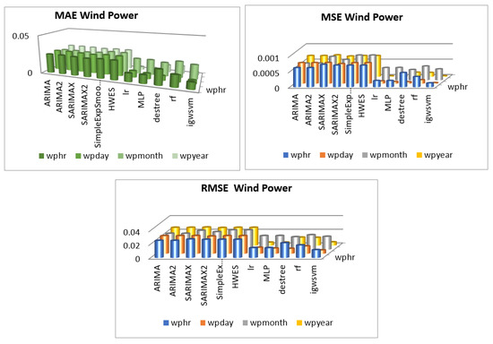 Wind power comparisons of various models for the different forecasting period (wphr—hourly wind power, wpday—daily wind power, wpmonth—monthly wind power, and wpyear—yearly wind power).