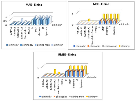 Wind El Niño comparisons of various models for the different forecasting period (elnino hr—hourly El Niño, elninoday—daily El Niño, elnino mon—monthly El Niño, and elninoyr—yearly El Niño).