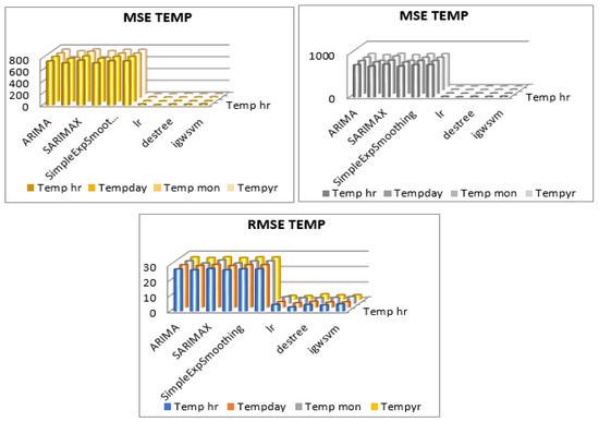 Temperature comparisons of various models for the different forecasting period (Temp hr—hourly temperature, Tempday—daily temperature, Tempmon—monthly temperature, and Tempyr—yearly temperature).