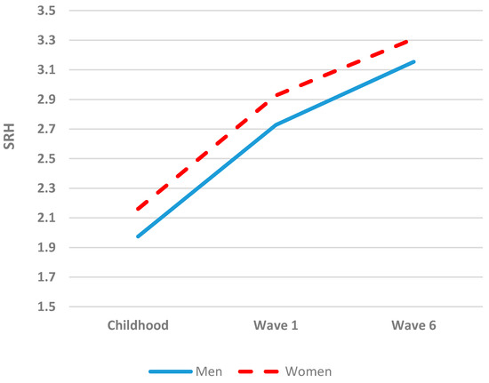 With regard to the first research question, the findings show that in Wave 1 the mean SRH of men was 2.728 and that 20.7% rated their health as less than good. The mean SRH of women was higher, at 2.927 and 28.43%, respectively, and the gap was found to be significant. The gender gap was again significant in Wave 6, with 37.41% of men and 43.33% of women rating their health as less than good. This gender difference was also valid in the respondents’ retrospective reportage of their SRH in childhood (Figure 1).